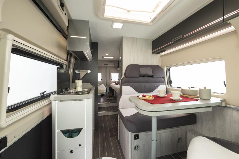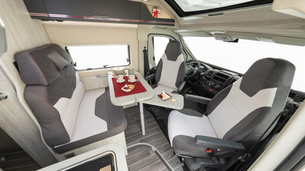 Die Essecke in unserem "CARLO" bietet vielseitige Nutzungsmöglichkeiten. Dank der praktischen Drehfunktion lässt sich der Tisch mühelos erweitern, um den Komfort und die Flexibilität während deiner Wohnmobilreise zu maximieren.