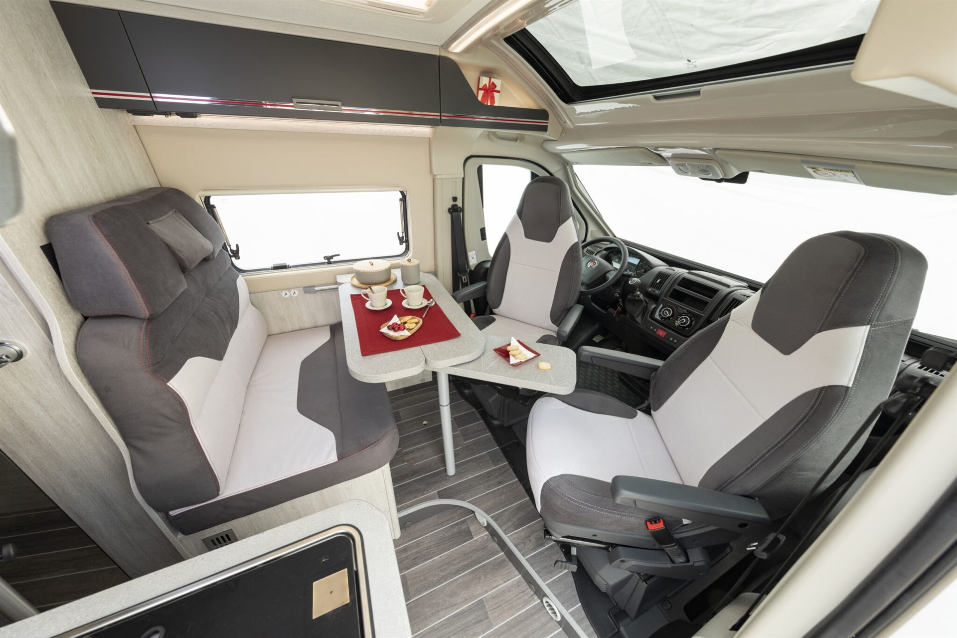 Die Essecke in unserem "CARLO" bietet vielseitige Nutzungsmöglichkeiten. Dank der praktischen Drehfunktion lässt sich der Tisch mühelos erweitern, um den Komfort und die Flexibilität während deiner Wohnmobilreise zu maximieren.