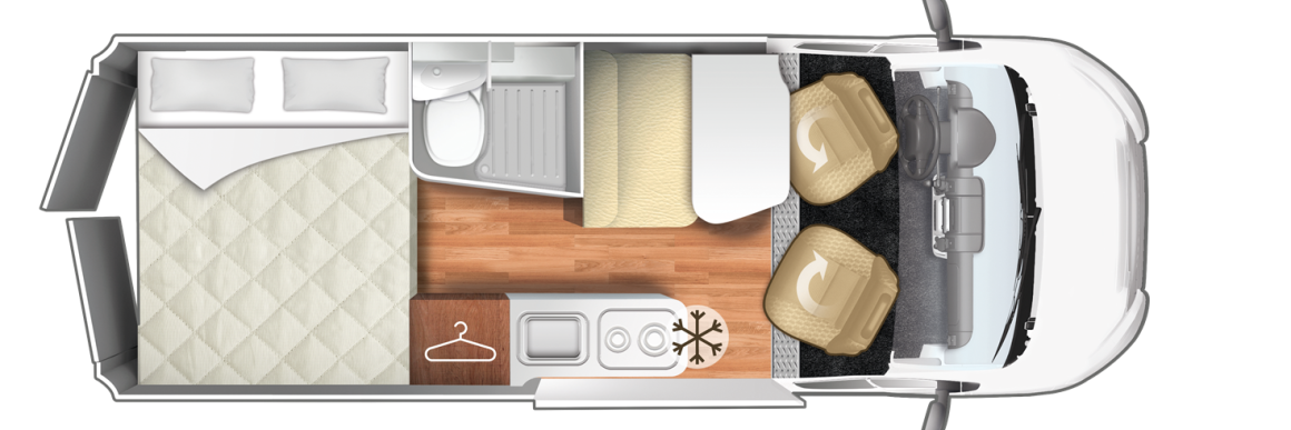 Unser „Plus-Modell“ ANJA vereint auf kompakter Länge von nur 5,99 m Komfort und Vielseitigkeit. Mit ihrem Querbett und dem praktischen Aufstelldach bietet sie Platz für bis zu vier Personen und ist somit ideal für spontane Ausflüge mit Familie oder Freunden.